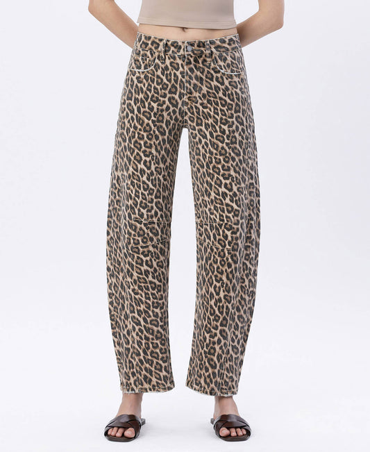 HIGH RISE LEOPARD PRINT BARREL JEANS