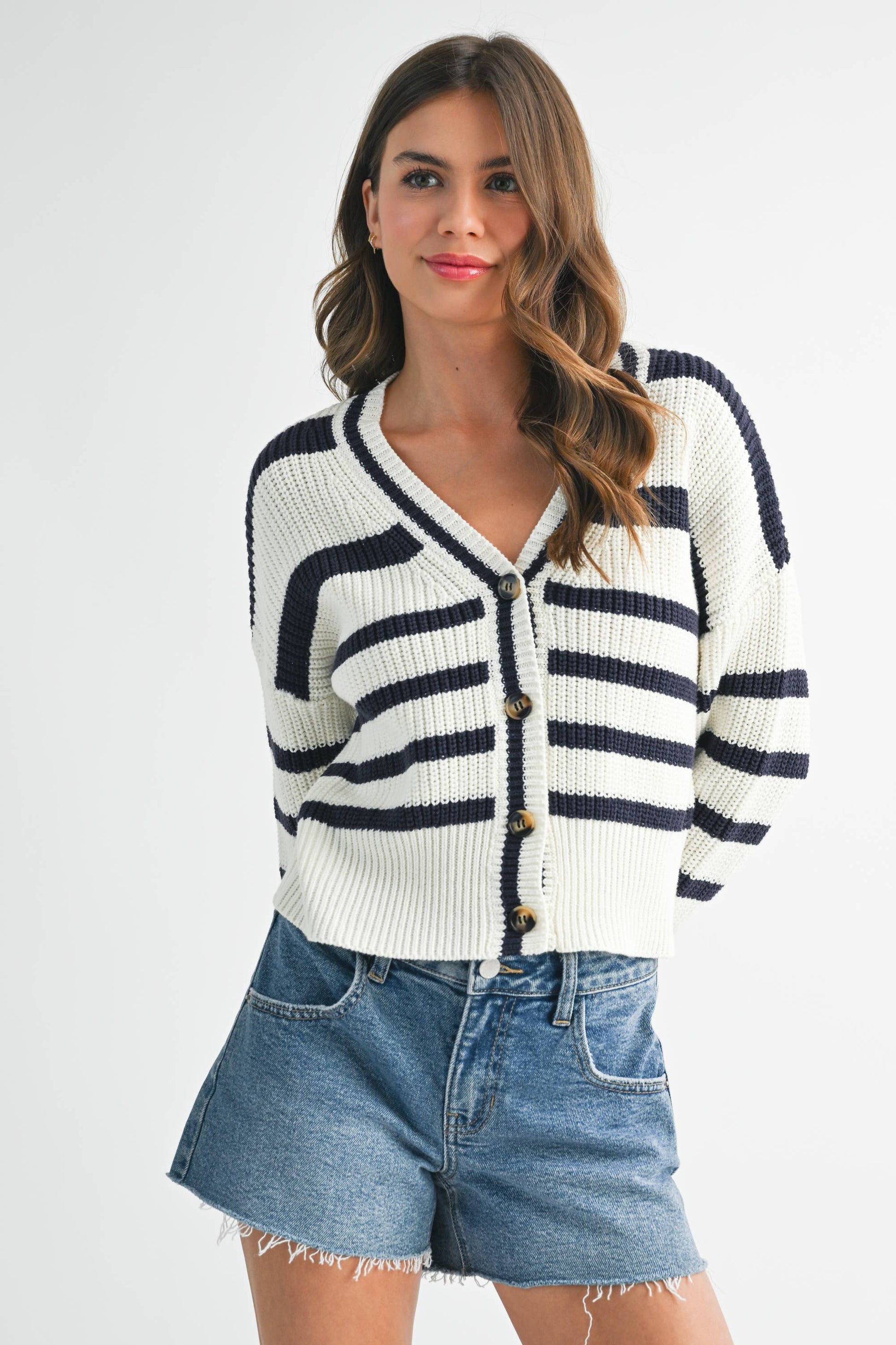 The Bona Striped Cardigan is a perfect blend of comfort and style. Featuring an eye-catching stripe pattern, button closure, and rib detailing, it is a fashionable and versatile addition to your wardrobe.