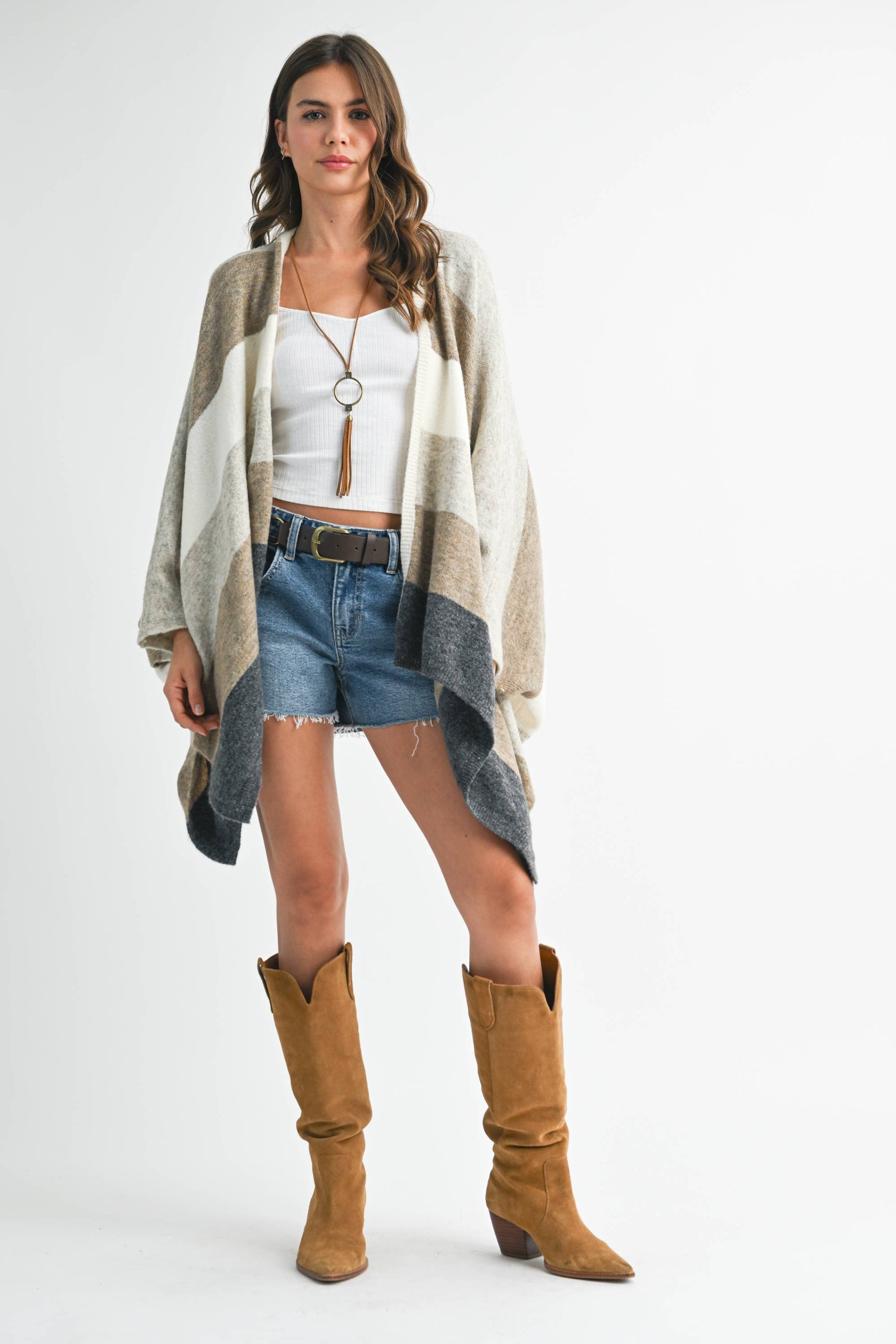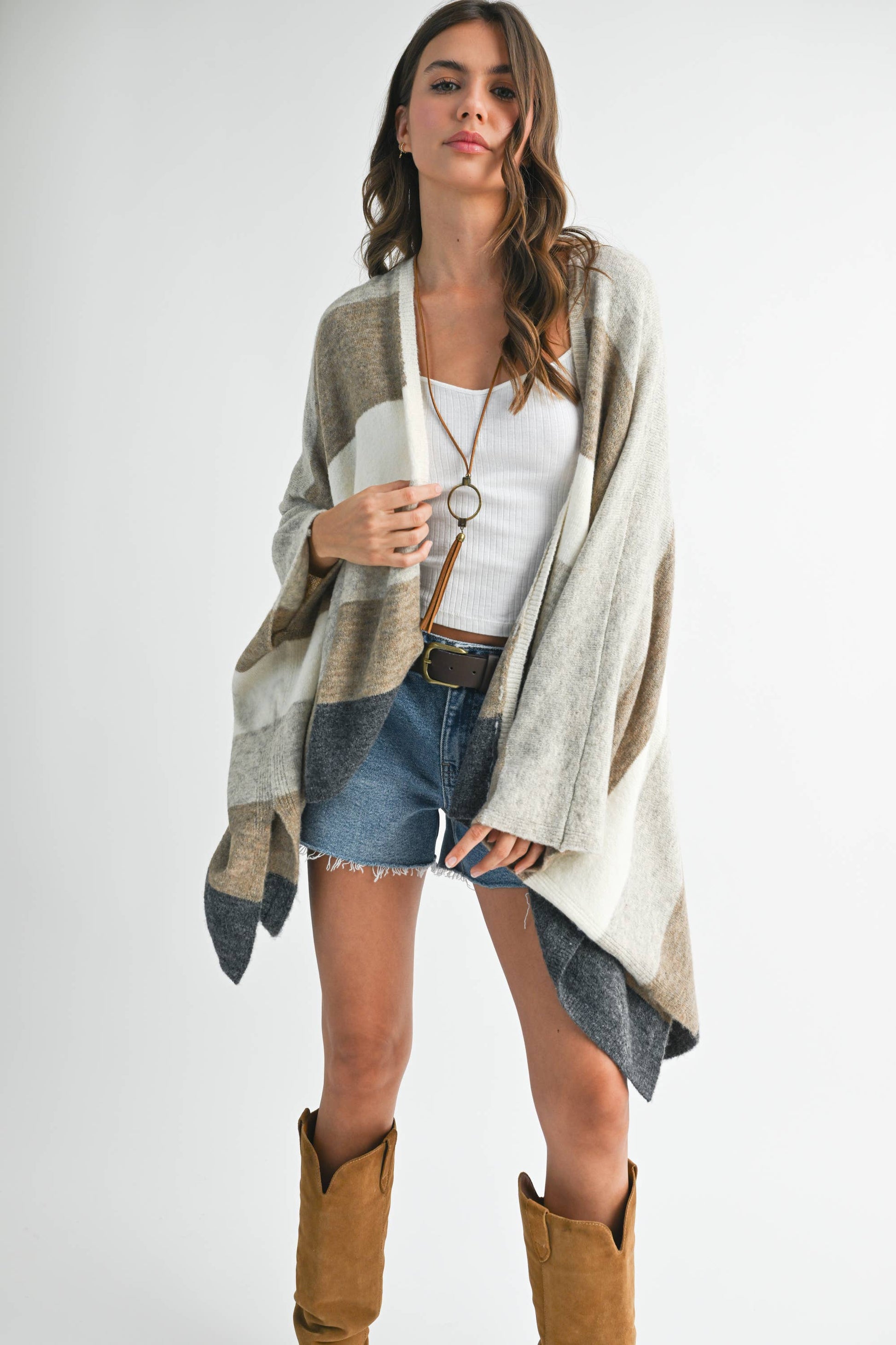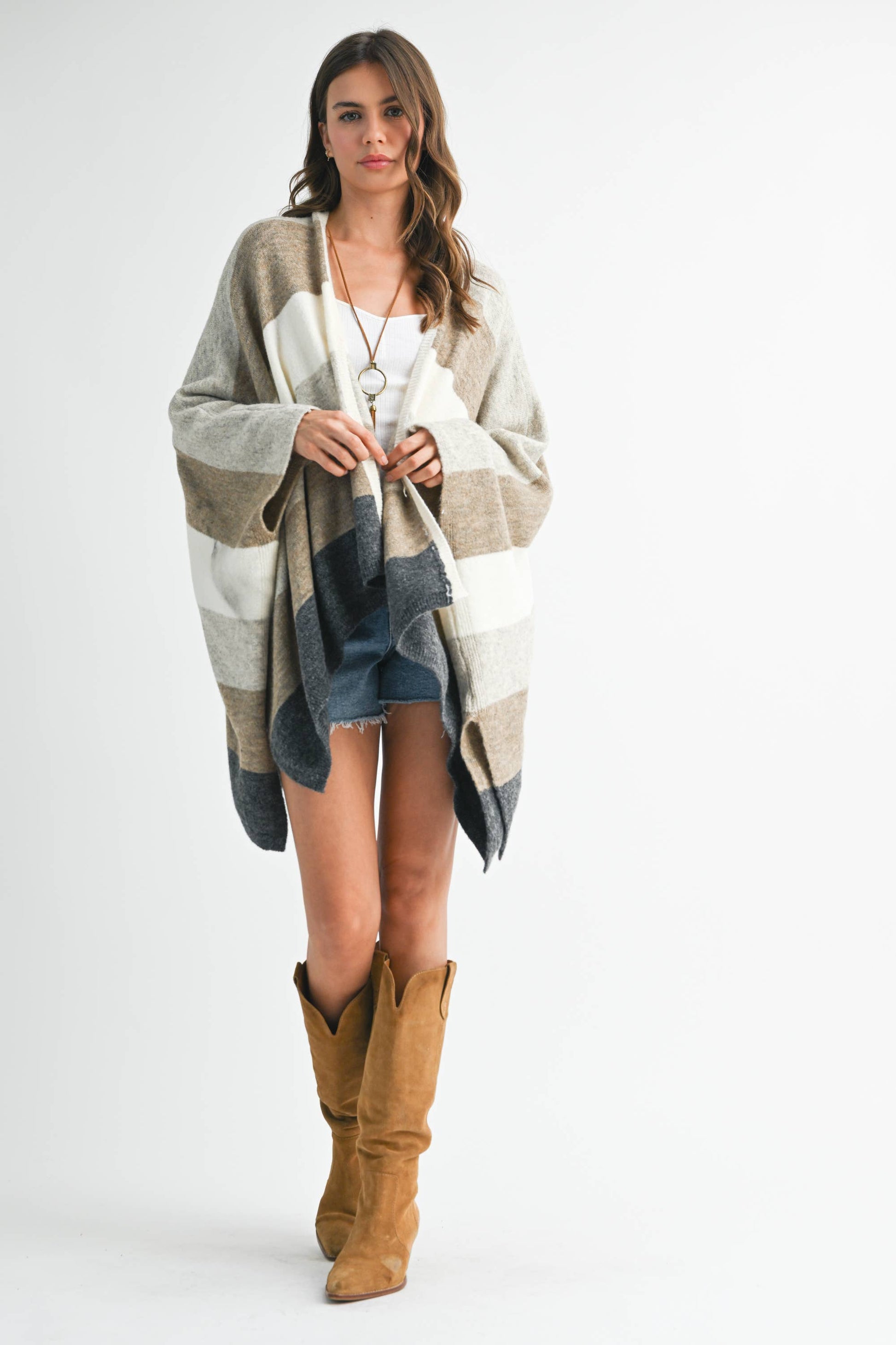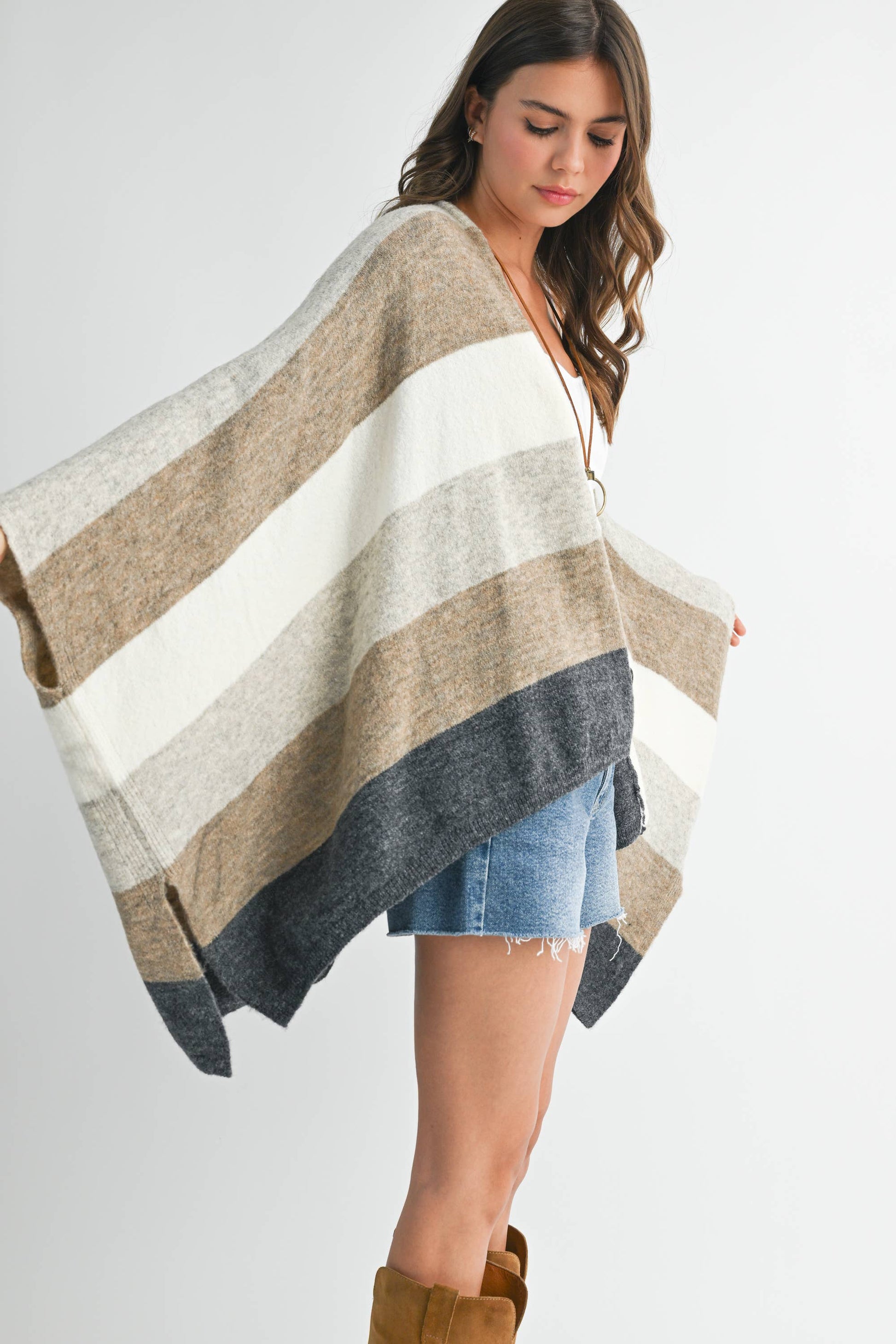 Zuri poncho cardigan features an open front design and striped detailing for an effortlessly stylish look. With ribbed trims and a side split hem, it's sure to become a wardrobe staple.