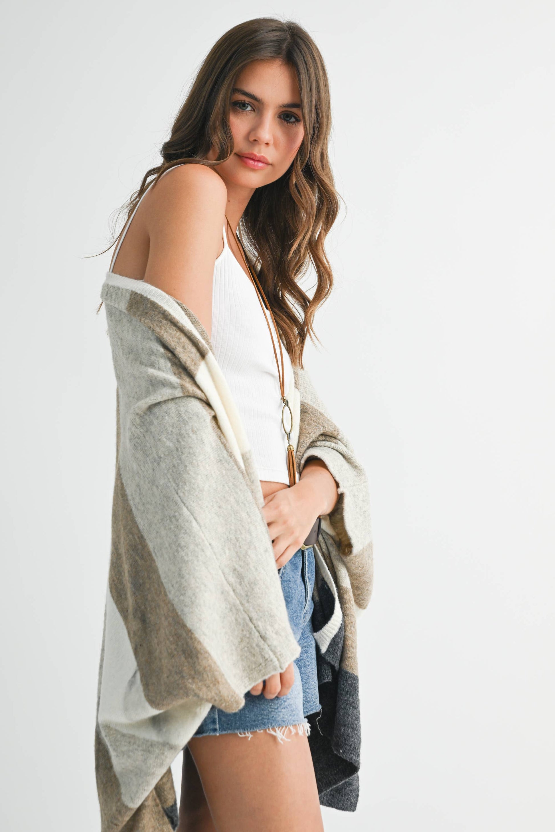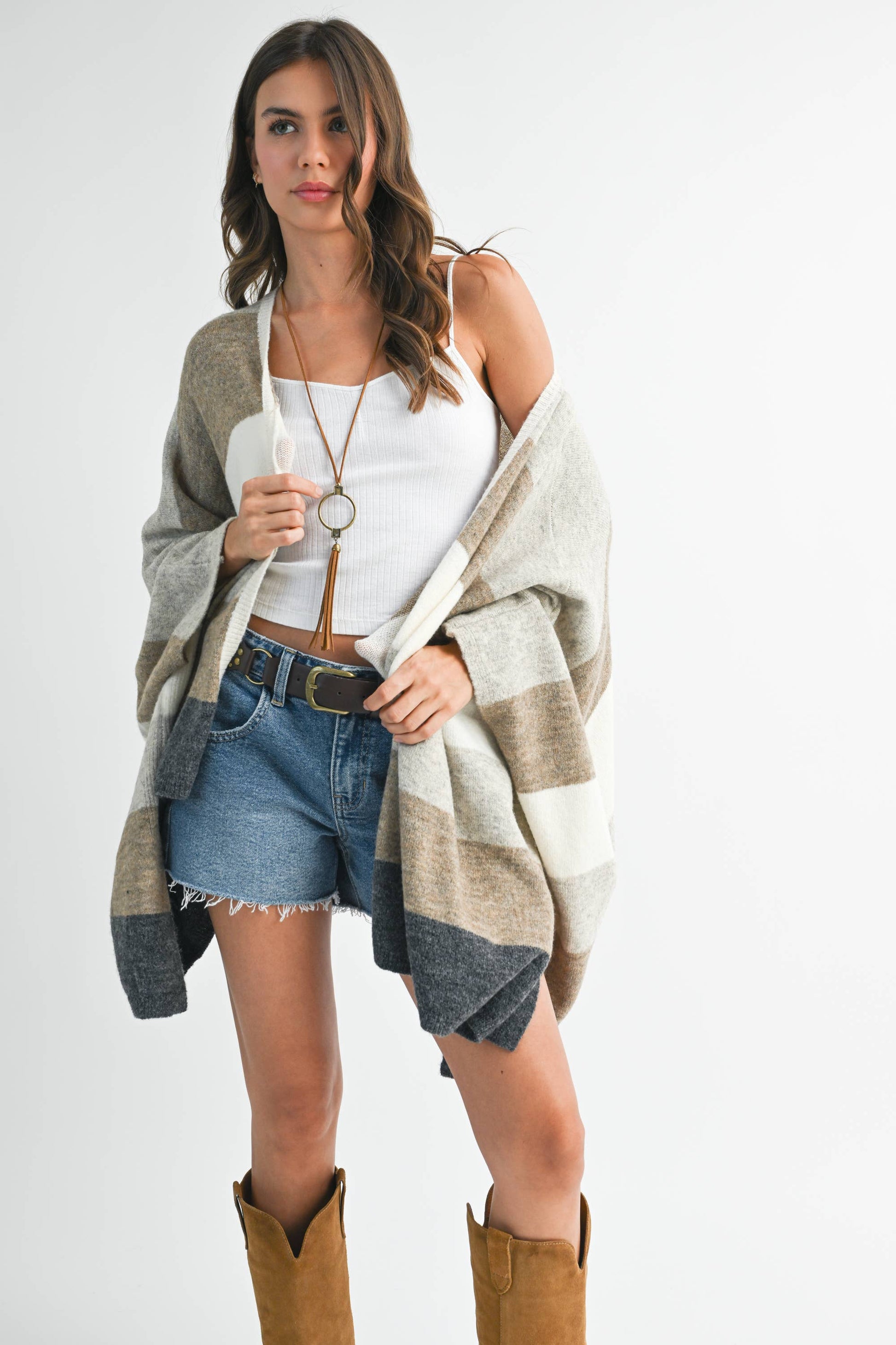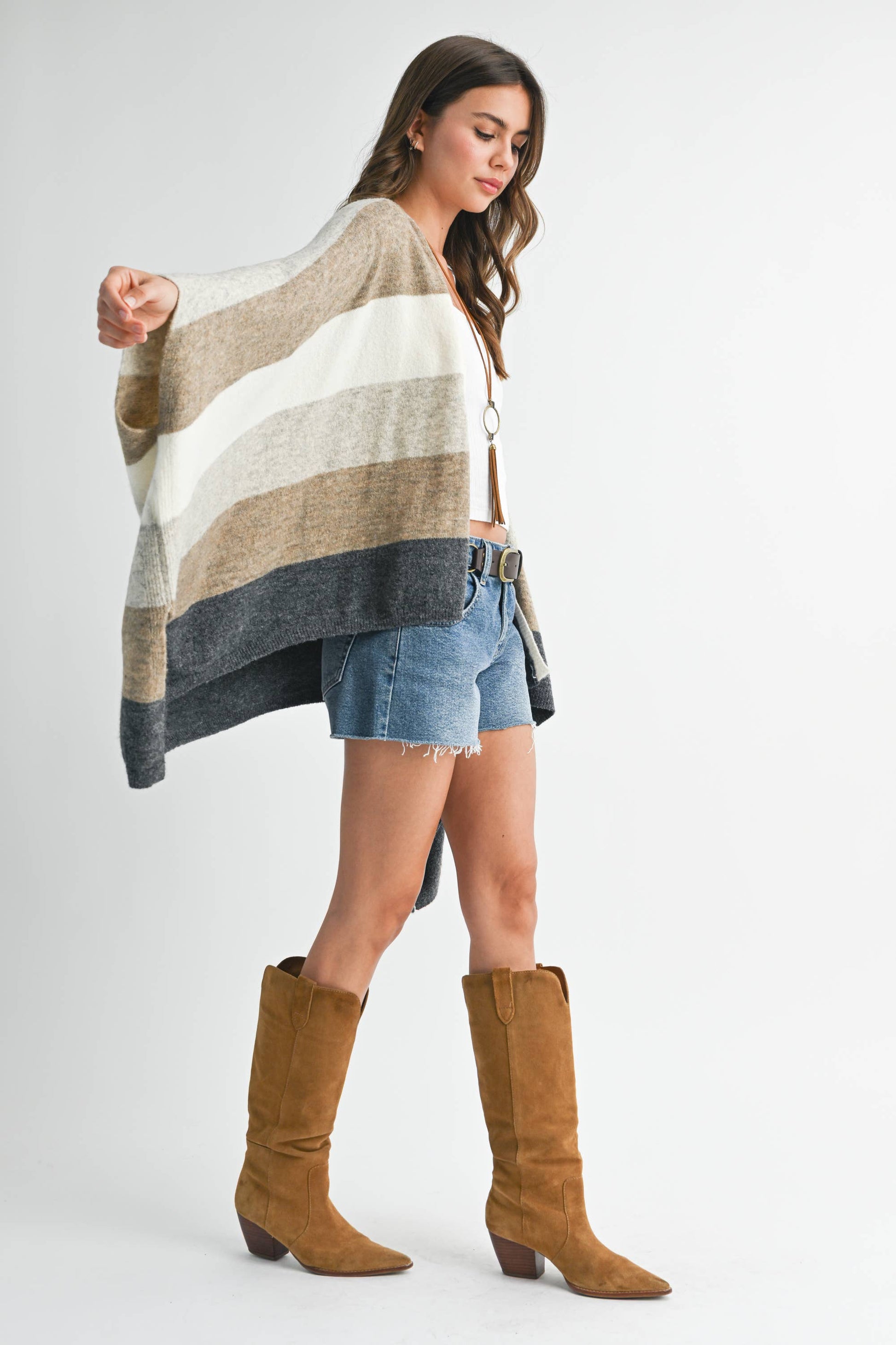 Zuri poncho cardigan features an open front design and striped detailing for an effortlessly stylish look. With ribbed trims and a side split hem, it's sure to become a wardrobe staple.