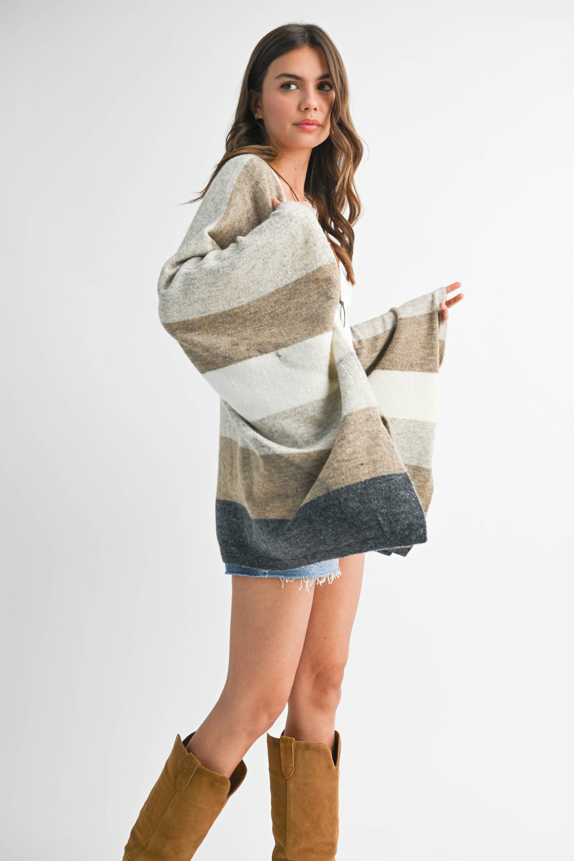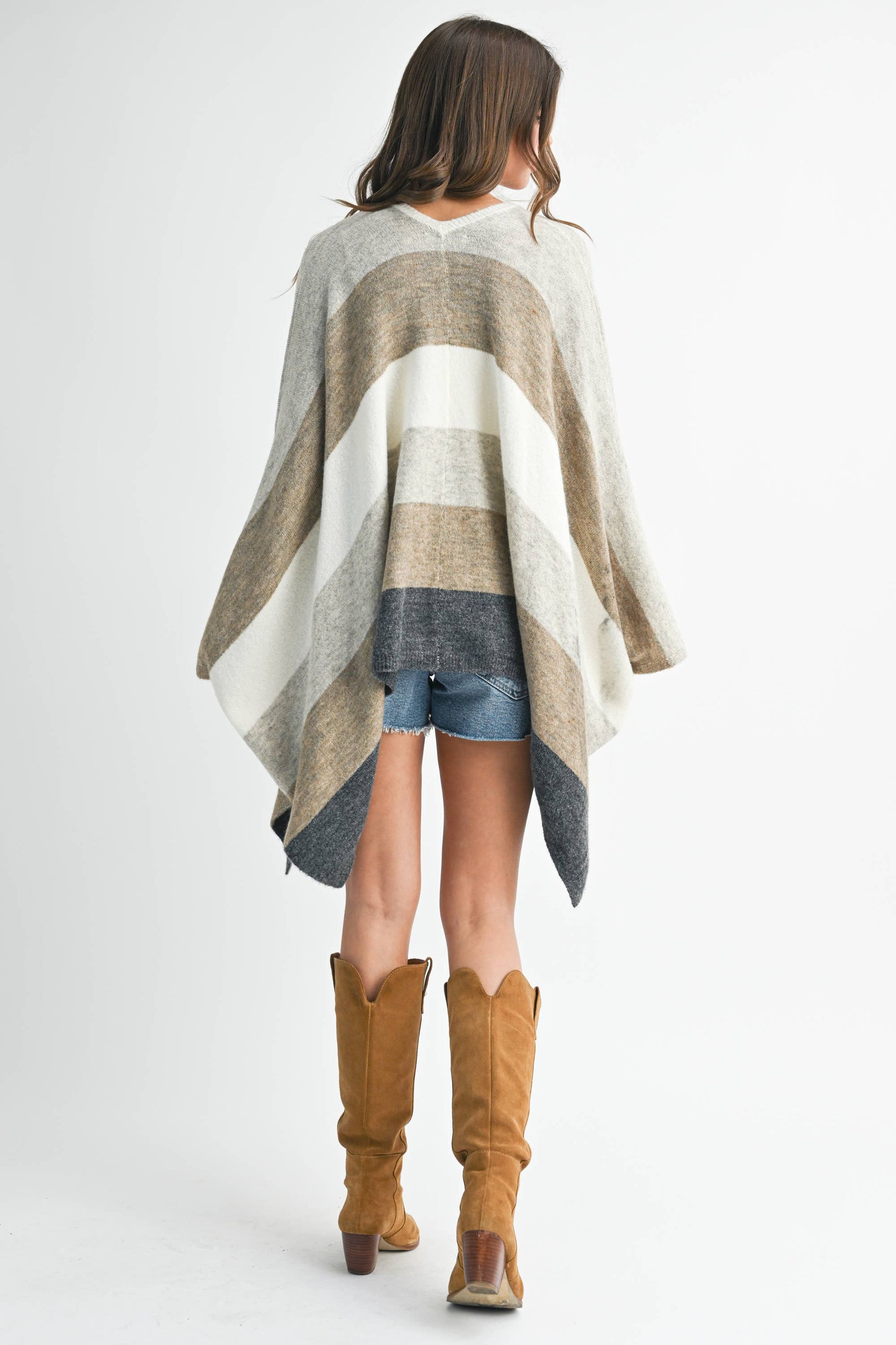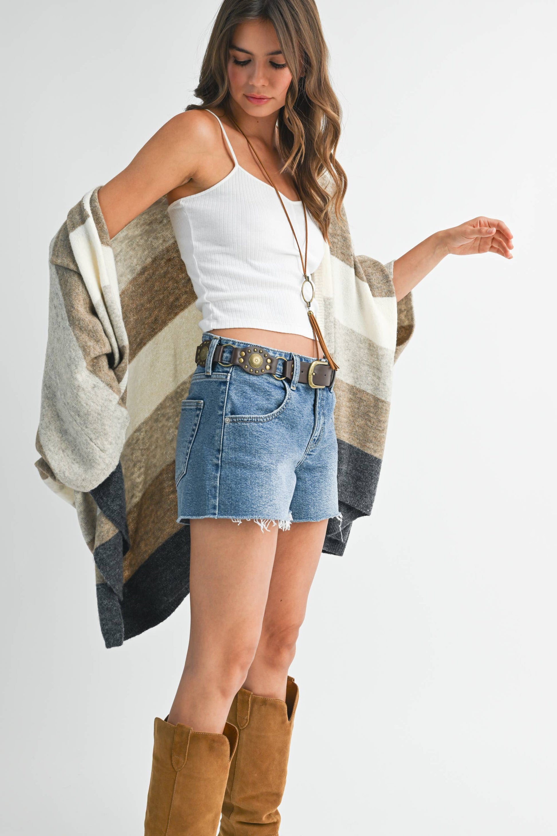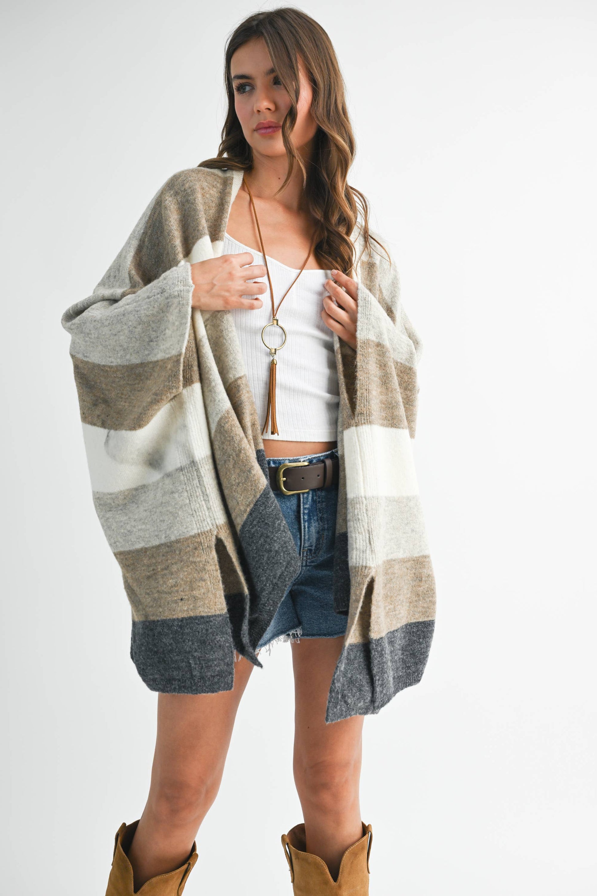 Zuri poncho cardigan features an open front design and striped detailing for an effortlessly stylish look. With ribbed trims and a side split hem, it's sure to become a wardrobe staple.