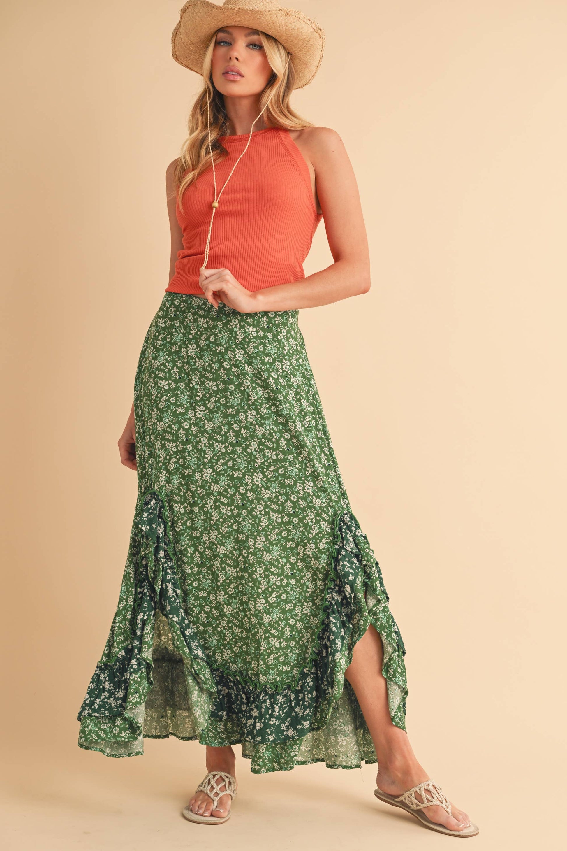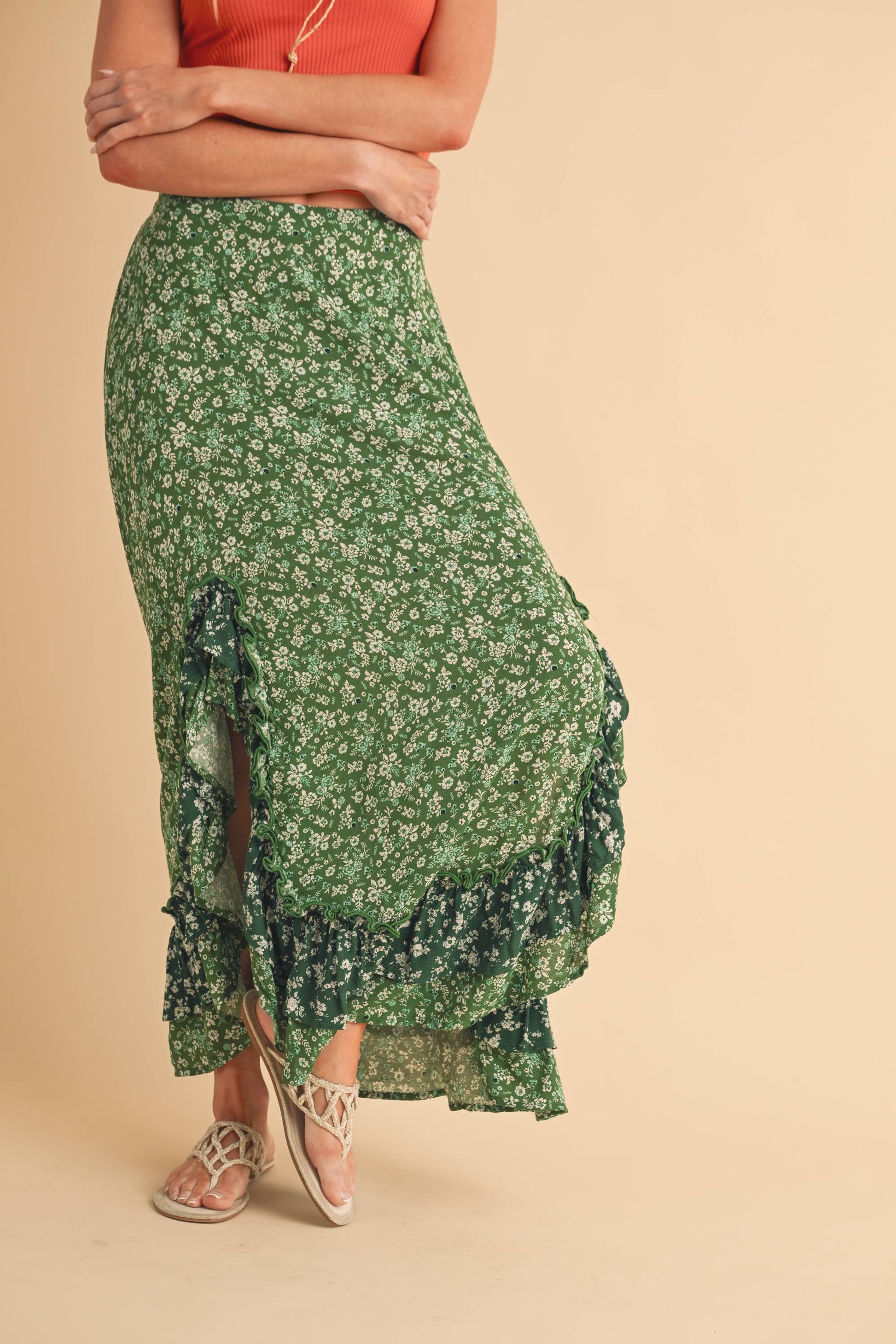 This dreamy Sachi skirt is adorned with dainty florals and delicate ruffle details for a whimsical finish. Flowing and feminine, it pairs perfectly with a chunky knit or a breezy tank for effortless boho vibes.