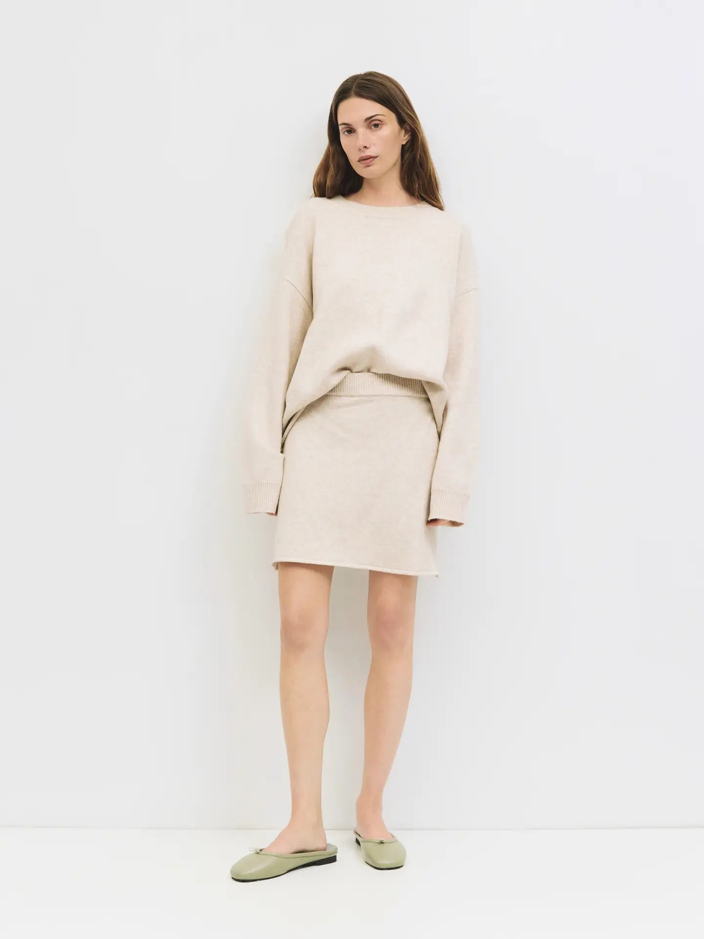 The Amanda Skirt is a relaxed-fit knit mini crafted from midweight fabric, featuring a ribbed waistband for a comfortable, secure fit. Finished with a rolled bottom hem, it pairs effortlessly with the Amanda Sweater
