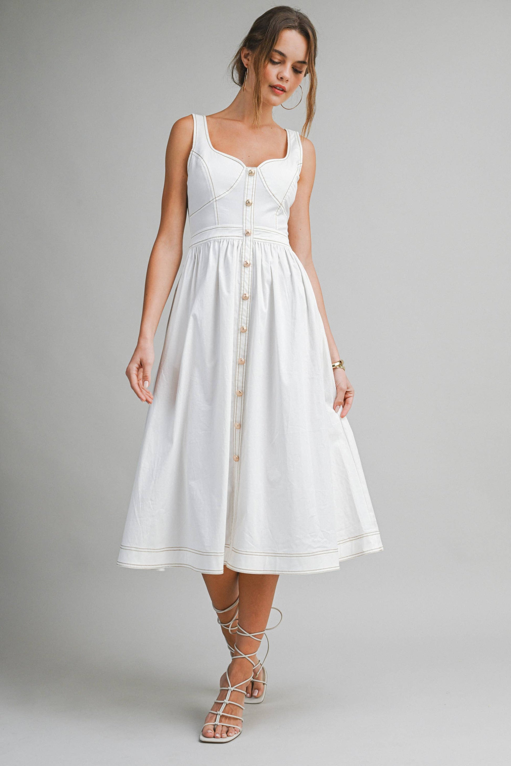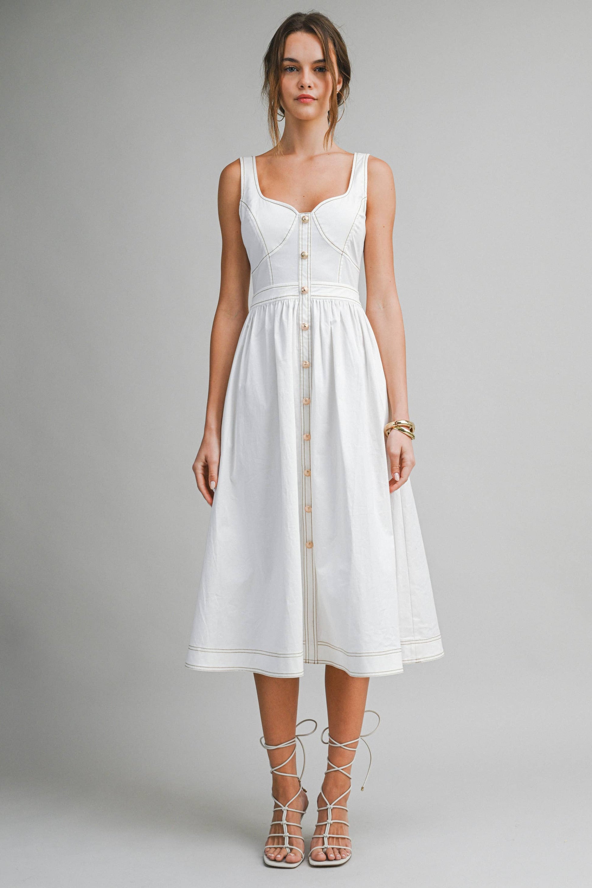Step into effortless elegance with this white button-front midi dress featuring a structured corset-style bodice and wide straps for a flattering, supportive fit. The flowy A-line skirt creates beautiful movement, while contrast stitching adds a touch of modern detail. Perfect for summer events, brunch, vacations, or everyday chic styling, this timeless sundress offers a clean, feminine silhouette you'll wear season after season.