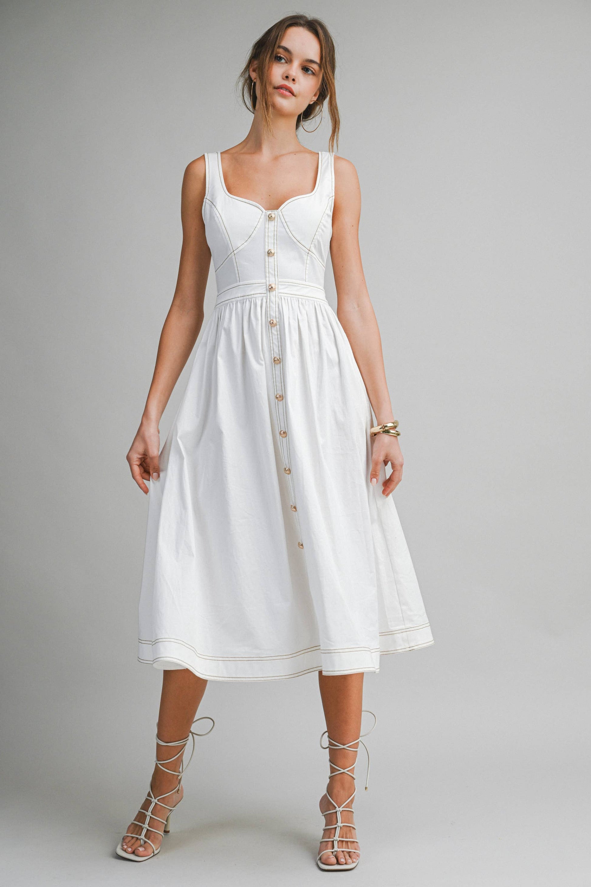 White Button-Front Midi Dress - Elegant Corset Bodice Summer Sundress
