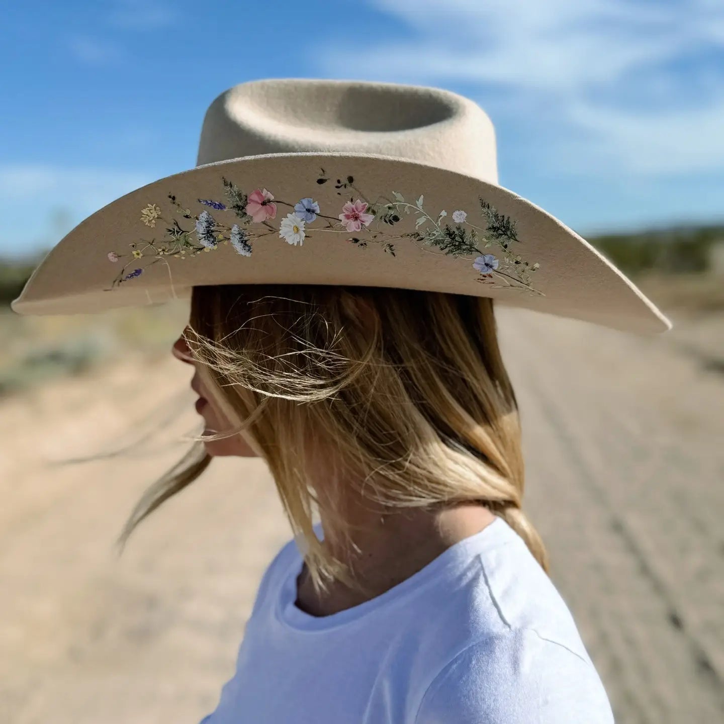 Meet The Katie Lou. Crafted from 100% luxurious Australian wool, a biodegradable, renewable, and natural resource. The Katie Lou features delicate wildflowers on both sides of our tan cowboy hats. All hats have an adjustable inner band (see video). All hats have an adjustable inner band! All artwork on Wild As Heck hats is handmade by various women artists. Each hat is handmade to order. The application method is a proprietary method that took Wild As Heck over 2 years to develop. The images are not hand painted, but hand applied with our method. All artwork is waterproof and will not smudge. Style: Cowboy Hat bodies are produced by our partner factory in China, and all shaping, artwork, and primary labor is done at our warehouse in Missouri.