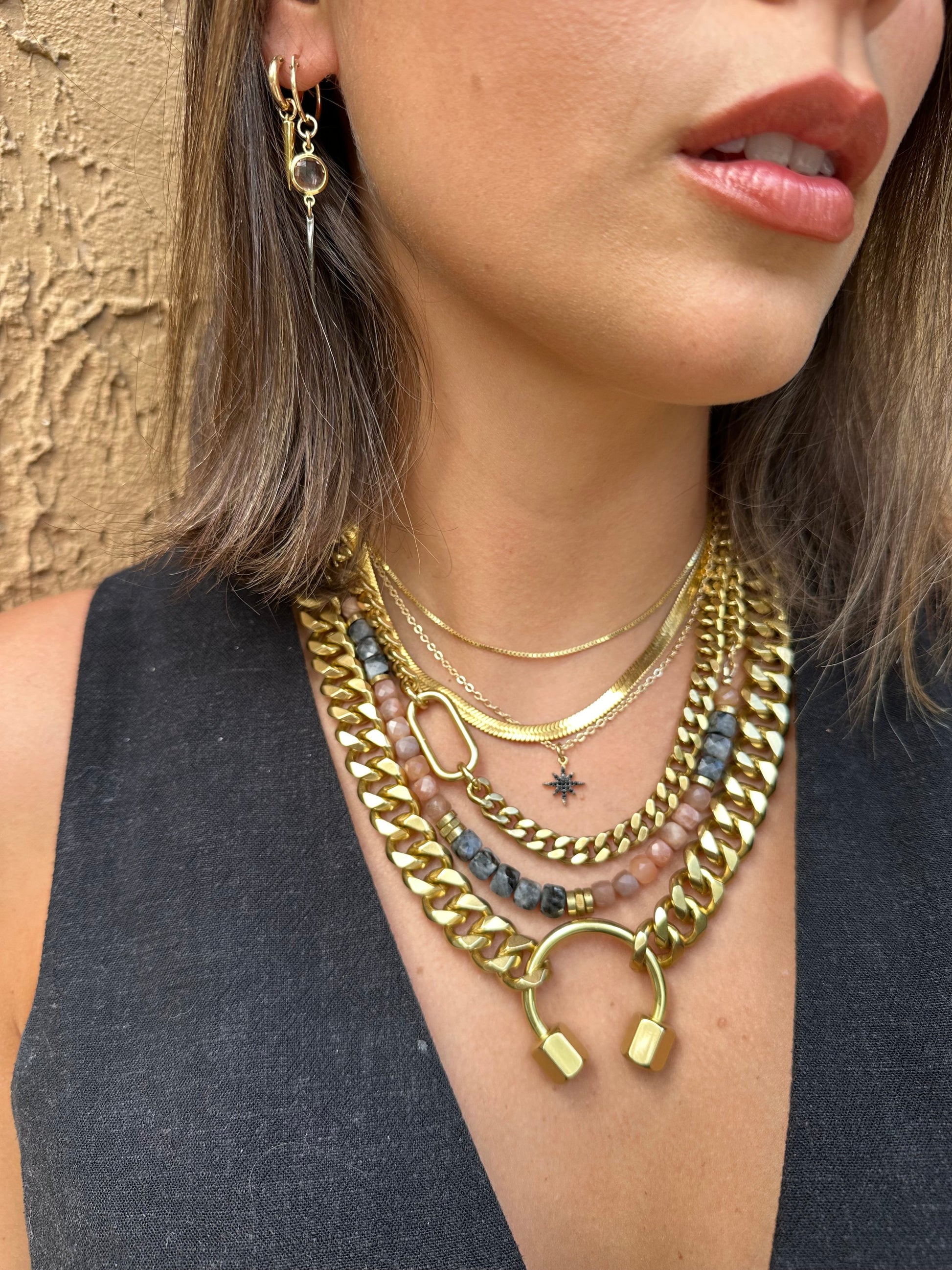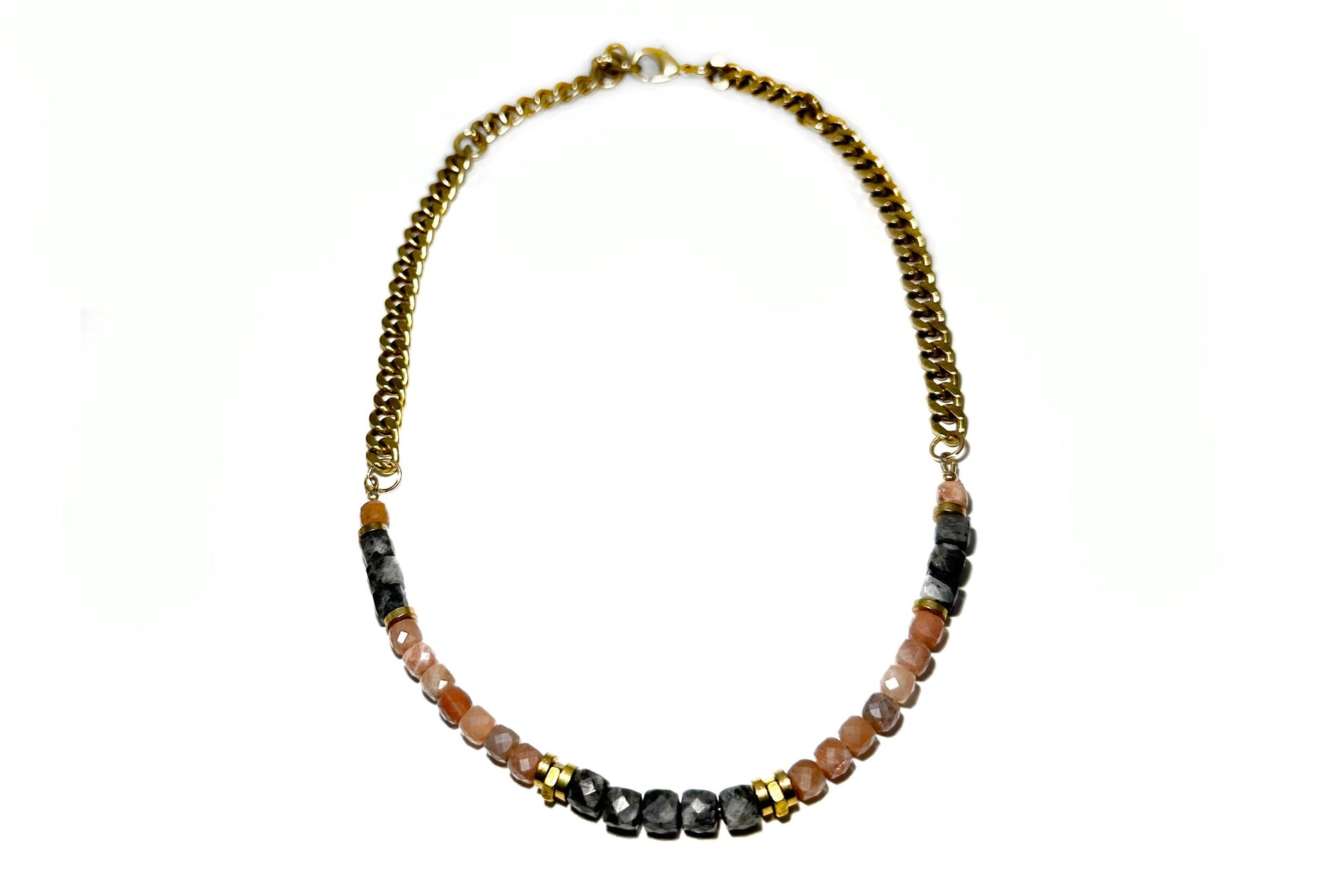 NEW! Faceted Larvikite & Peach Moonstone necklace exude all the vibrations of rich earthy glamour. Perfect as the finishing touch to your everyday look or as the centerpiece to your day-to-evening look.