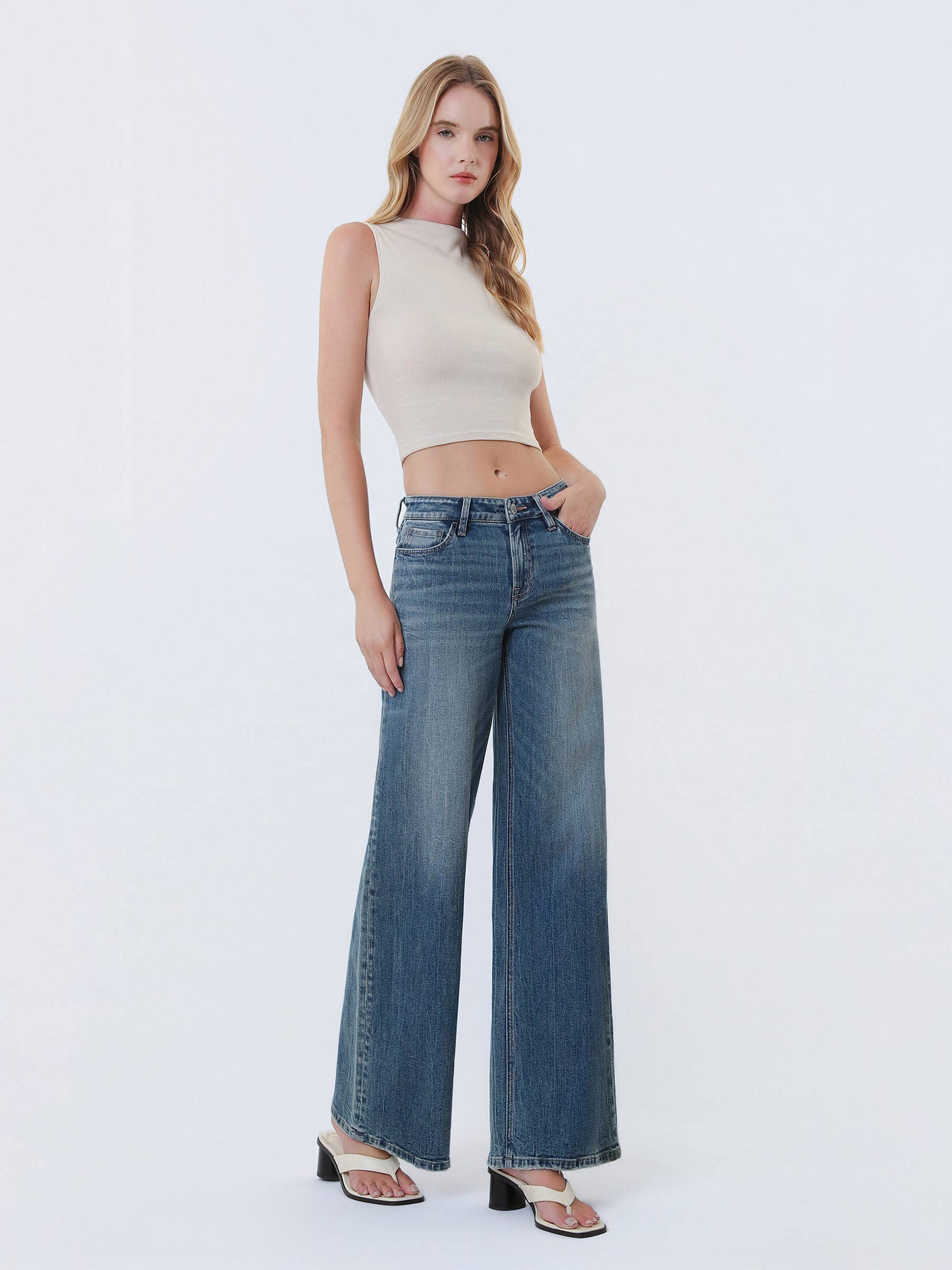 MID RISE MEDIUM DARK WASH WIDE LEG JEANS