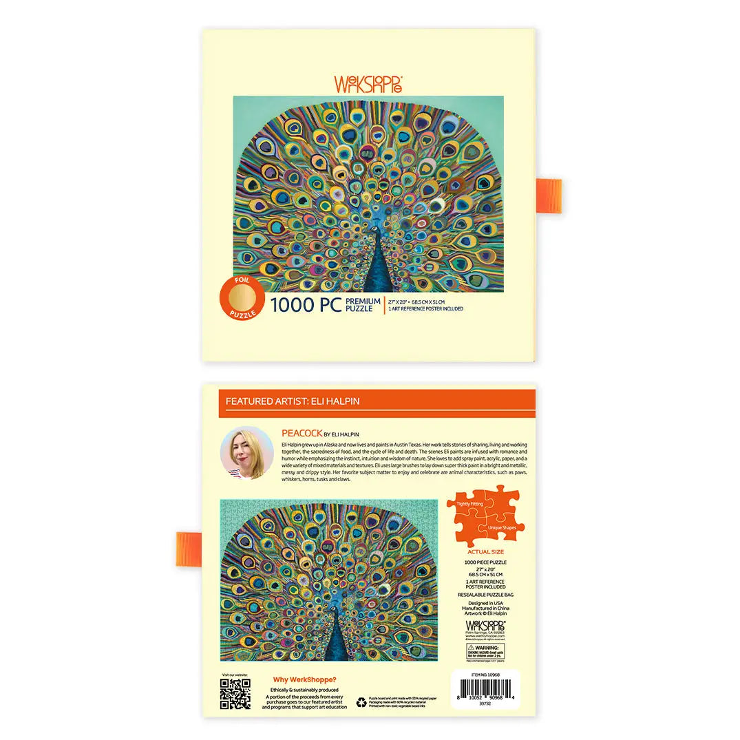 Experience the dazzling spectacle of the Peacock 1000-piece jigsaw puzzle by artist Eli Halpin. This breathtaking illustration is a vibrant masterpiece, capturing the full display of the peacock's tail feathers in a hypnotic pattern of jewel-toned "eyes." The bold, expressive brushstrokes use rich blues, greens, yellows, and pinks, making this a challenging and visually rewarding puzzle. To enhance its luxurious beauty, the puzzle features striking gold foil detailing that brings an iridescent shimmer to the feathers. With 1000 pieces and a finished size of 27" x 20", this stunning puzzle is a must-have for bird lovers, art collectors, and anyone seeking a high-quality, richly detailed puzzling experience. Product Details * 1000-piece jigsaw puzzle, embellished with gold foil * Assembled puzzle size: 27" W x 20" H * Includes 1 reference art insert * 100% recycled board & non-toxic vegetable-based ink * Precision cut pieces with minimal puzzle dust * Resealable zip-top bag for puzzle piece storage * Premium slipcase drawer box * Box - 9" L x 9" W x 2" D * Recommended age: 13+ years * Art created globally, imported Art by Eli Halpin