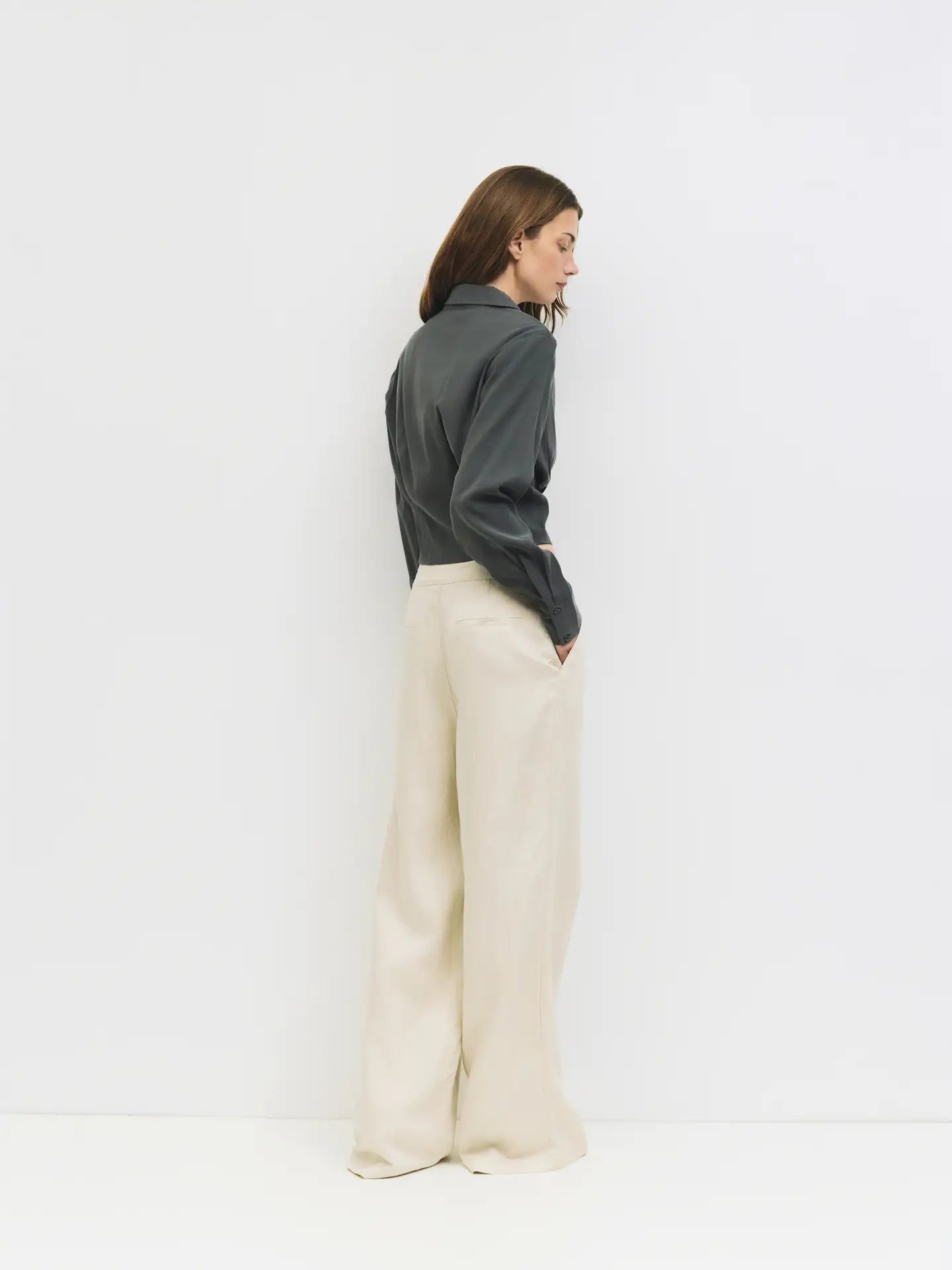 The Violeta Top is a slim-fit button-down blouse with a collared neckline and long sleeves. It features a tapered, pleated waist and a cropped length for a modern silhouette.